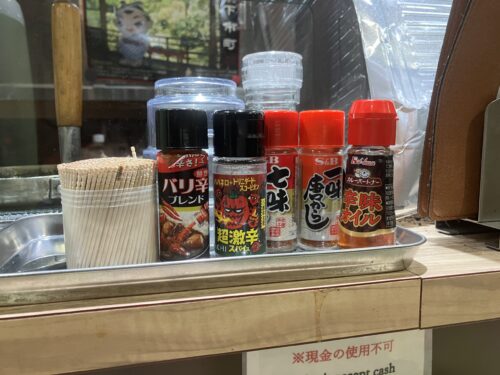 カウンター上には辛味パウダーや辛味オイル等の調味料があり