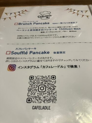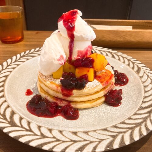 インスタメニューは、季節ごとのフルーツなどを使用したスフレパンケーキのようです。