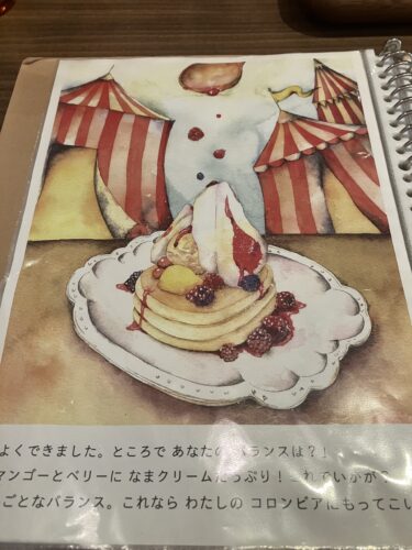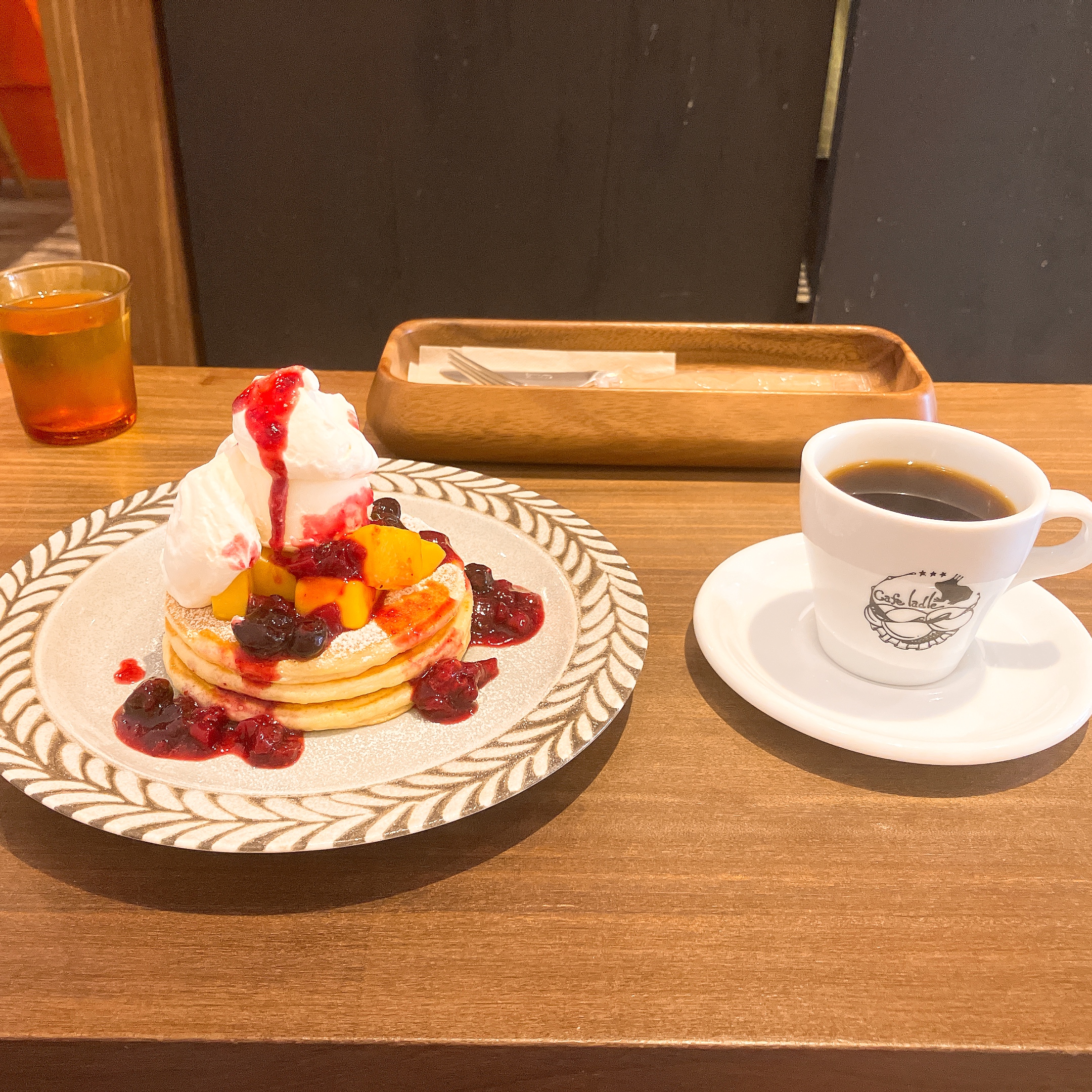 少し悩んで、マンゴー&ベリーパンケーキにホットコーヒーを注文しました。