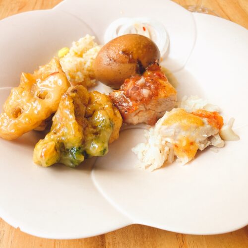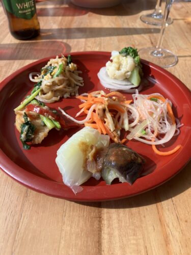 種類は豊富だし、それぞれの料理に札で説明書きがあり分かりやすいです。どれから食べよう〜と悩みながら、少しずつで全種類制覇できたら良いなとまずは一皿目。