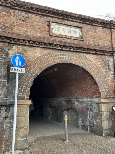 ねじりまんぽ(蹴上インクラインの下を横断するためのトンネルです。)を通り抜けながらレトロな明治建築に味を感じます。