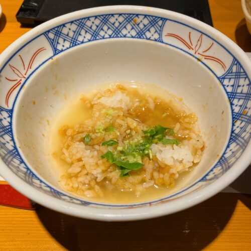 残しておいたご飯に、薬味と熱々の鯛出汁をかけて。