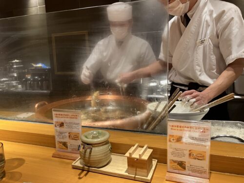 カウンターのガラス越しに天ぷらを揚げているところを眺めて。