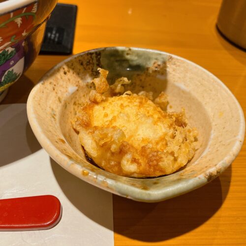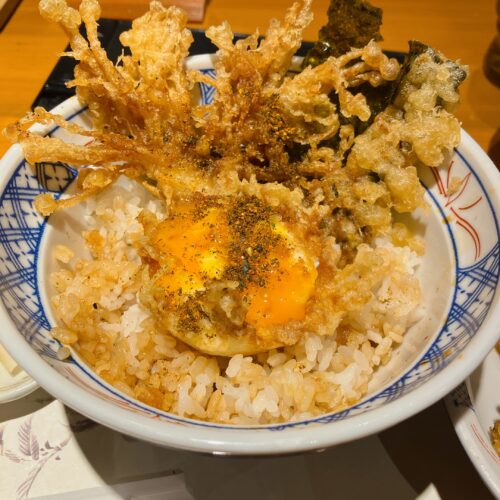 天ぷらを半分以上頂いたら、ご飯の上に玉子天を乗っけて。