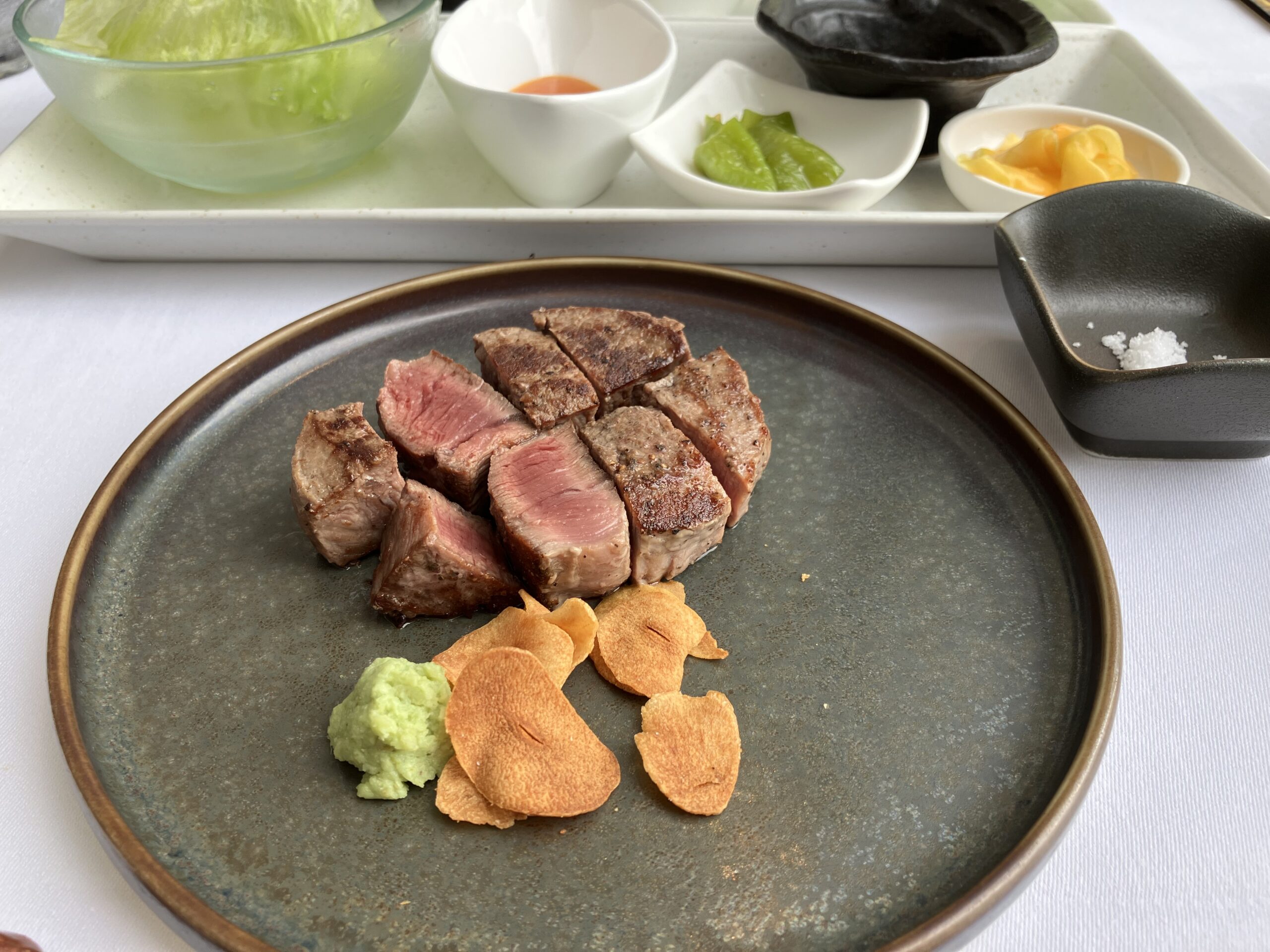 わさび、ガーリックチップ、沖縄の塩、九州醤油、ポン酢、味噌ベースのタレが付いています。