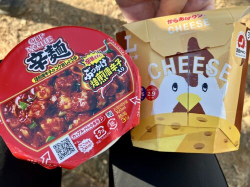 出発は阪急山本駅。すぐ近くにローソンがあるので、おにぎりと唐揚げくんを買って出発しました。